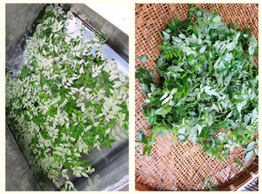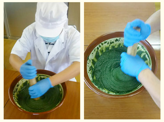 葉を磨り潰します ここでの味付けが重要砂糖と味噌を加えていきます 味噌も地元御代田町の生え抜きの味工房産